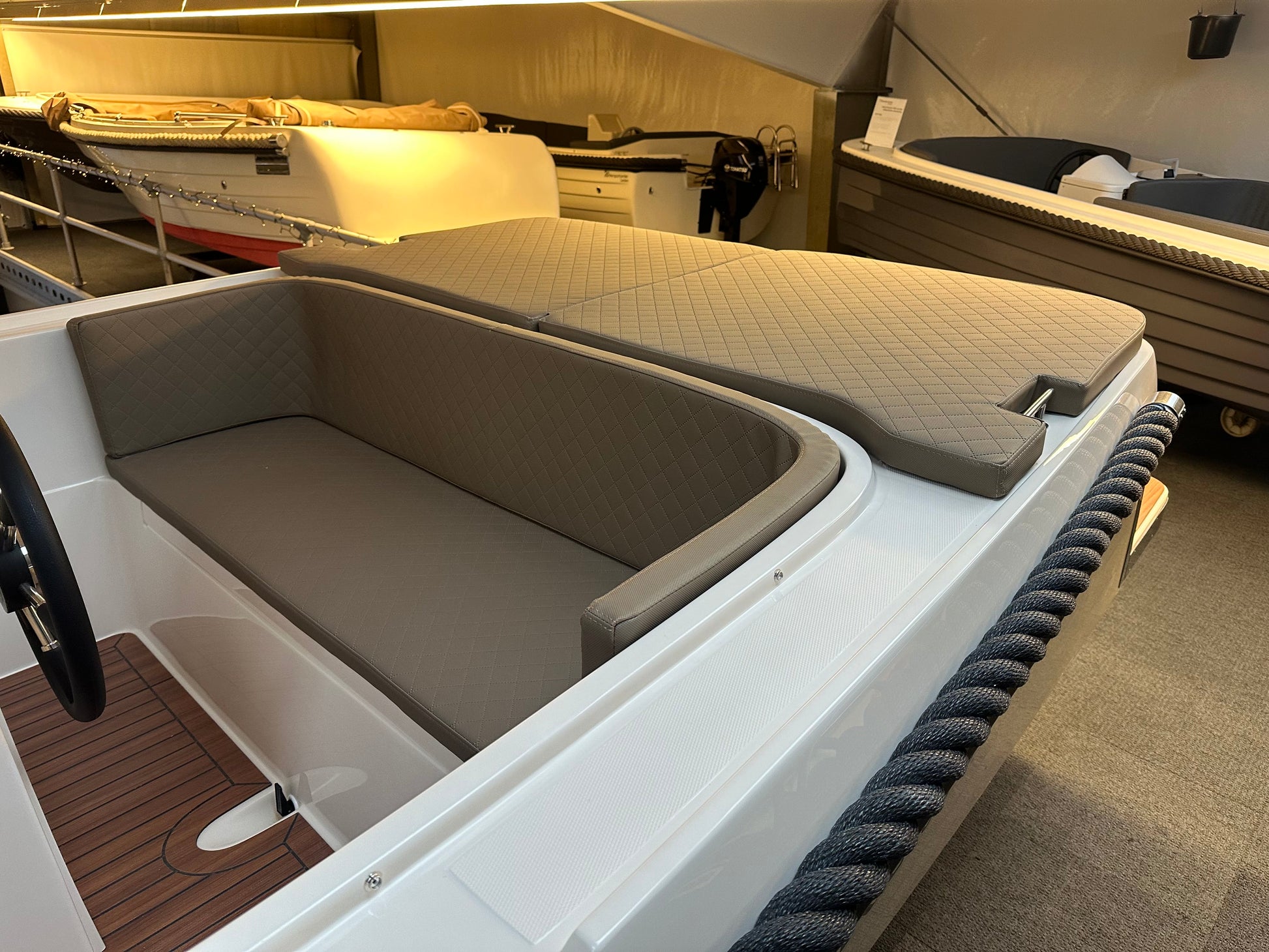 Wat een ruimte heeft deze Solvaré 590 Tender! Met een motor in de bun waarop een bunkussen komen, heb je een zee aan ruimte. Ook de ruime rondzit aan de voorkant kan in een handomdraai omgetoverd worden tot een heerlijk zonnedek met kussen. Eindeloos genieten dus op het water met deze luxe uitgevoerde tender sloep.